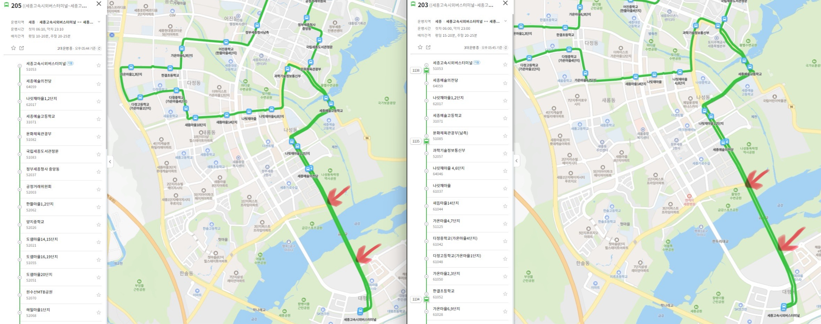 안녕하세요, 205번 버스는 세종시의 1,2생활권과 세종시외터미널을 연결해주는 편리한 노선입니다. 다만, 세종시외버스터미널 정류소와 그 다음 정류소(세종 예술의전당 정류소)와의 간격이 너무 멀어 이용에 어려움이 있습니다. 금남교 전후에 정류소가 신설된다면, 금강 주변에 거주하는 주민들과 금강 주변 상권을 이용하시는 시민분들의 편의성이 크게 증대될것으로 생각합니다. 205번 버스 외에도 203번 버스, 801번 버스 또한 금남교를 거쳐 운행하지만 금강 주변에서 해당 버스들의 탑승을 위해서는 세종시외버스터미널 정류소로 향해야만 합니다. 첨부한 노선 사진을 참고하시면, 세종시외버스터미널 정류소와 다음 정류소 사이 간격이 매우 먼 것을 확인하실 수 있습니다. 금남교 전후로 정류소를 신설한다면, 다음과 같은 효과를 기대할 수 있습니다. 1. 3생활권에서, 세종국립도서관과 세종 호수공원을 비롯한 세종 1,2생활권으로의 왕래 편의성 향상 2. 금강 이응다리와 금강 주변 상권 접근성 향상으로 인한 이용인원 증가 3. 멀리 떨어진 정류소 사이의 간극을 메움으로써 동선의 효율성 증가 세종시의 더 나은 미래를 응원합니다. 감사합니다. |