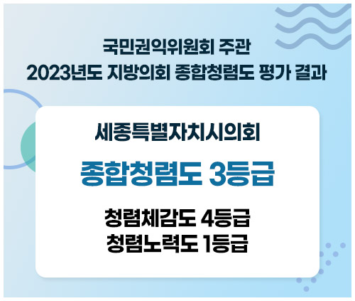 | 2023년도 세종특별자치시의회 청렴도 평가 결과 공개 세종시의회 2024-01-29 조회수 322 |