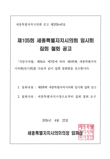 | 제105회 세종특별자치시의회 임시회 집회 철회 공고 세종시의회 2026-04-22 조회수 8 |
