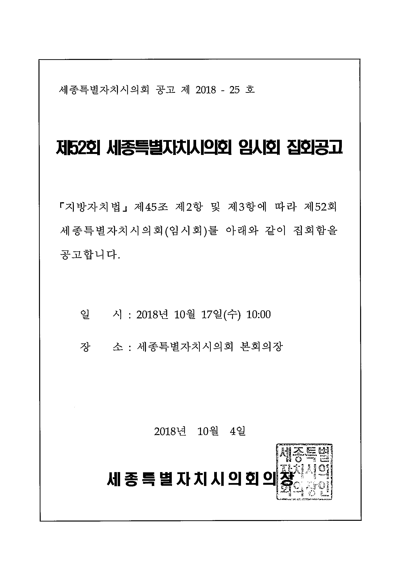 | 제52회 세종특별자치시의회 임시회 집회공고 세종시의회 2018-10-04 조회수 1214 |