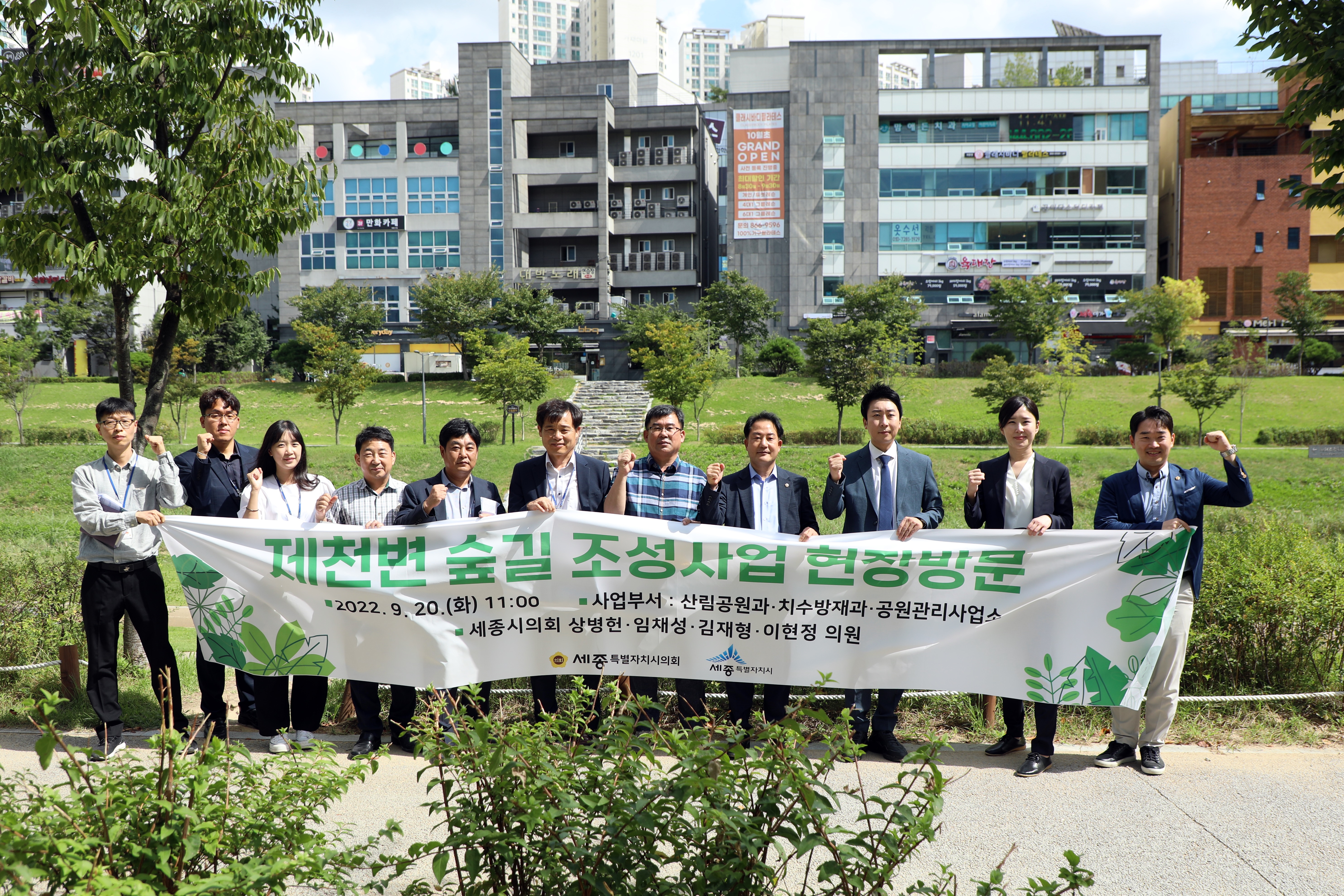 세종특별자치시의회 상병헌 의장과 임채성 행정복지위원장, 김재형‧이현정 의원은 20일 제천변을 방문해 현장을 점검하고, 아름동과 고운동, 종촌동으로 이어지는 숲길 조성방안에 대해 논의했다.