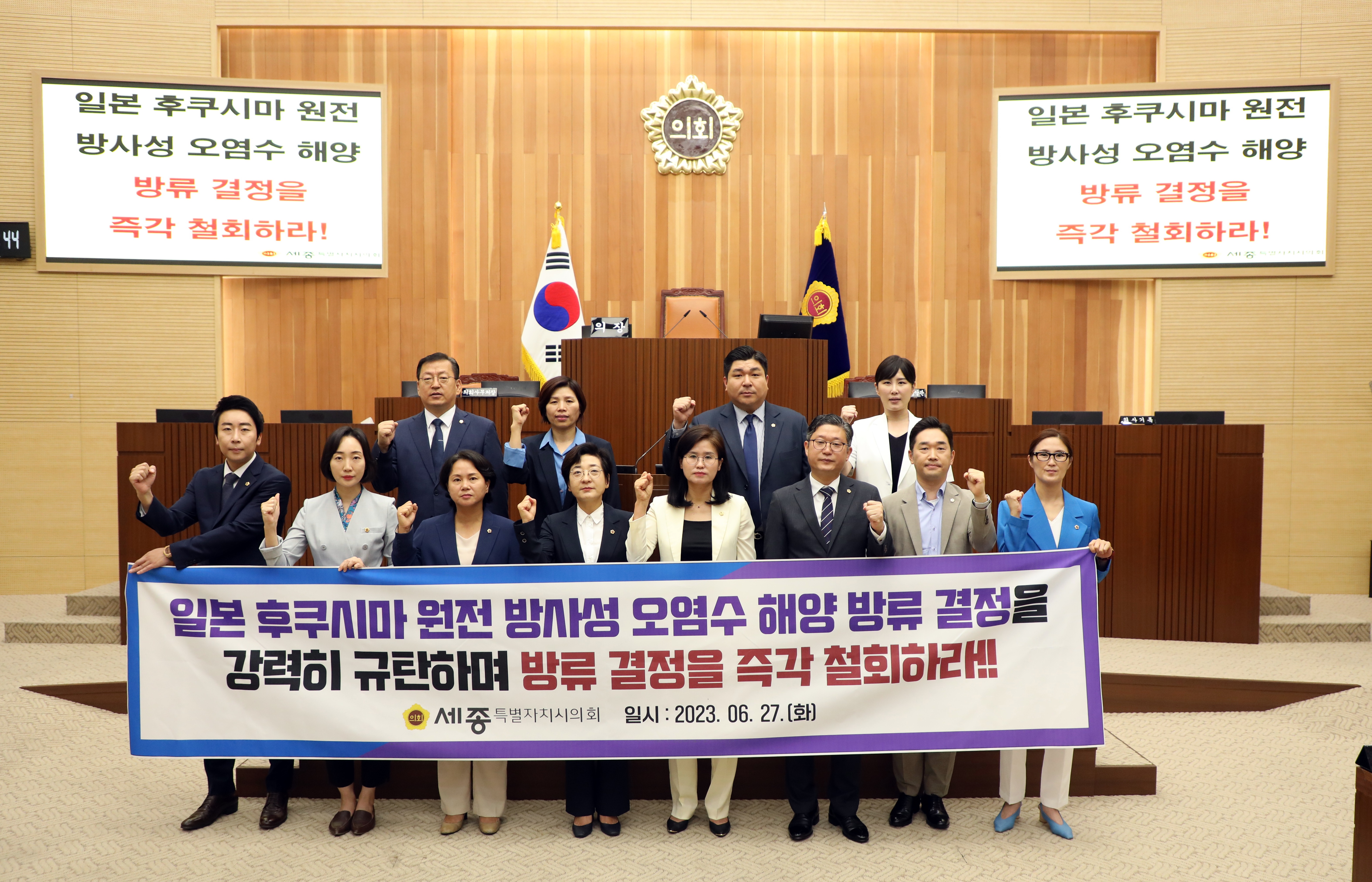 세종특별자치시의회(의장 이순열)는 27일 제83회 정례회 3차 본회의에서 여미전 의원이 대표 발의한 ‘일본 후쿠시마 원전 오염수 해양 방류 결정 규탄 및 철회 촉구 결의안’을 채택했다. 이번 결의안에는 일본 후쿠시마 제1원전 방사능 오염수를 30년에 걸쳐 해양에 방류하려는 일본의 행태를 규탄하며, “일본은 방류 결정을 즉각 철회해야 하고 정부는 단호하게 대응해야 한다”고 촉구하는 내용이 담겼다. 여미전 의원(더불어민주당)은 “일본 정부는 후쿠시마 원전 오염수의 안전성 논란에도 불구하고, 단지 경제적인 이유로 해양 방류를 강행하려고 하고 있다”며, “삼중수소 등 인체에 치명적인 방사성 물질이 포함된 원전 오염수 방류는 대한민국을 비롯한 태평양 인접국을 직접적으로 위협하는 심각한 범죄행위”임을 강조했다. 세종시의회는 “후손들에게 온전히 물려줘야 할 바다가 일본의 무책임하고도 비인도적인 행위로 파괴되어서는 안 될 것”이라며, “시민의 안전과 미래세대의 생존과도 직결된 일본 정부의 후쿠시마 오염수 해양 방류 결정을 즉각 철회해야 한다”고 결의안 채택의 이유를 밝혔다. 덧붙여 “정부는 국민의 생존권을 위협하는 행위를 좌시하지 말고 모든 수단과 방법을 동원하여 강력히 항의하고 단호히 대응해야 할 것”이라고 비판의 목소리를 높였다.