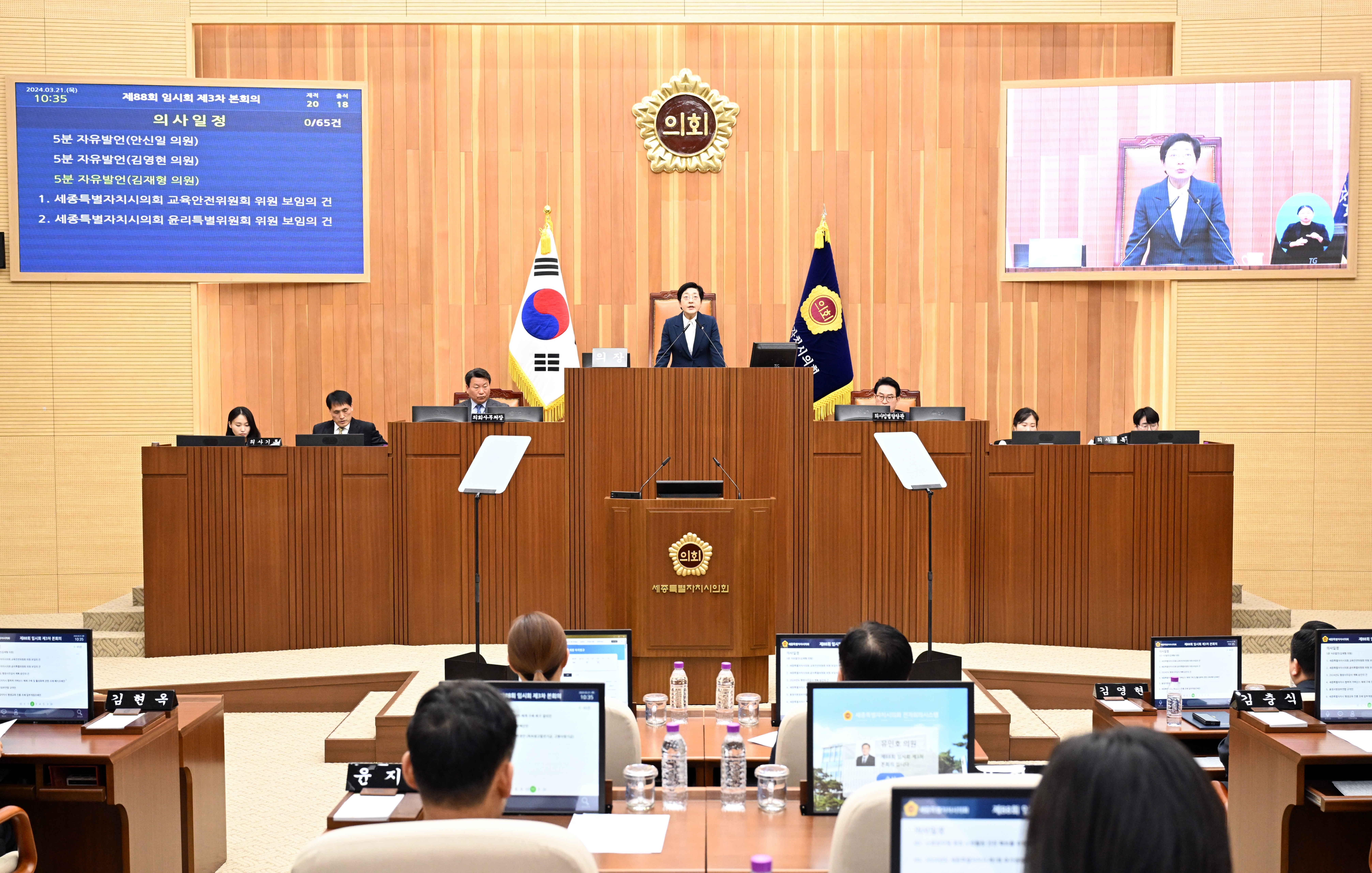 세종특별자치시의회(의장 이순열)는 21일 오전 10시 제88회 임시회 제3차 본회의를 열어 조례안 등 총 67개 안건을 처리하고 회기를 종료했다. 이날 본회의에서는 김현옥·상병헌·안신일·김영현·김재형 의원 등 5명의 의원이 5분 자유발언을 통해 시정·교육행정 발전을 위한 정책 대안을 제시했다. 제3차 본회의에서 최종 의결된 안건을 살펴보면, 의회운영위원회 소관 ‘2024년도 행정사무감사 계획 승인의 건’ 1건, 행정복지위원회 소관 ‘세종특별자치시 협력적 거버넌스 체제 구축 및 활성화에 관한 조례 폐지조례안’ 등 27건, 산업건설위원회 소관 ‘세종특별자치시 세종창업키움센터 운영 사무 민간위탁(재위탁) 동의안’ 등 22건, 교육안전위원회 소관 ‘세종특별자치시교육청 행정기구 설치 조례 일부개정조례안’ 등 11건이다. 아울러, 예산결산특별위원회에서 심사한 ‘2024년도 세종특별자치시 제1회 추가경정예산안’과 ‘2024년도 세종특별자치시 기금운용계획변경안’ 등 2건이 통과되었다. 더불어 결원된 비례대표 의석을 승계한 홍나영 의원은 세종특별자치시의회 교육안전위원회 및 윤리특별위원회 위원으로 보임됐다. 또한, 이날 본회의 의사일정 변경을 통해 “세종시문화관광재단 대표이사 임명 과정 관련 감사원 공익감사청구의 건”을 처리했다. 이순열 의장은 이날 회기를 마무리하는 폐회사에서 “교육부가 세종시 교육청에 지급하는 보통교부금 보정액을 대폭 삭감하여 세종 교육재정이 심각한 위기 상황”이라며, “세종시의회는 삭감된 보정액의 원상복구를 위해 세종시 교육청과 적극 협조하여 세종시법의 입법 취지에 맞게 적극적인 재정지원이 이뤄질 수 있도록 교육부를 상대로 강력히 촉구할 것”이라고 뜻을 밝혔다. 세종시의회는 이날 본회의 종료 후 “2027 충청권 하계세계대학경기대회 경기시설 건립 절차 조속 추진”과 “농업의 지속가능성 확보 및 식량안보 강화를 위한 농산물 가격안정제도 법제화”, “소방공무원 현장 소방활동 안전 확보를 위한 체계 구축”을 촉구했다.