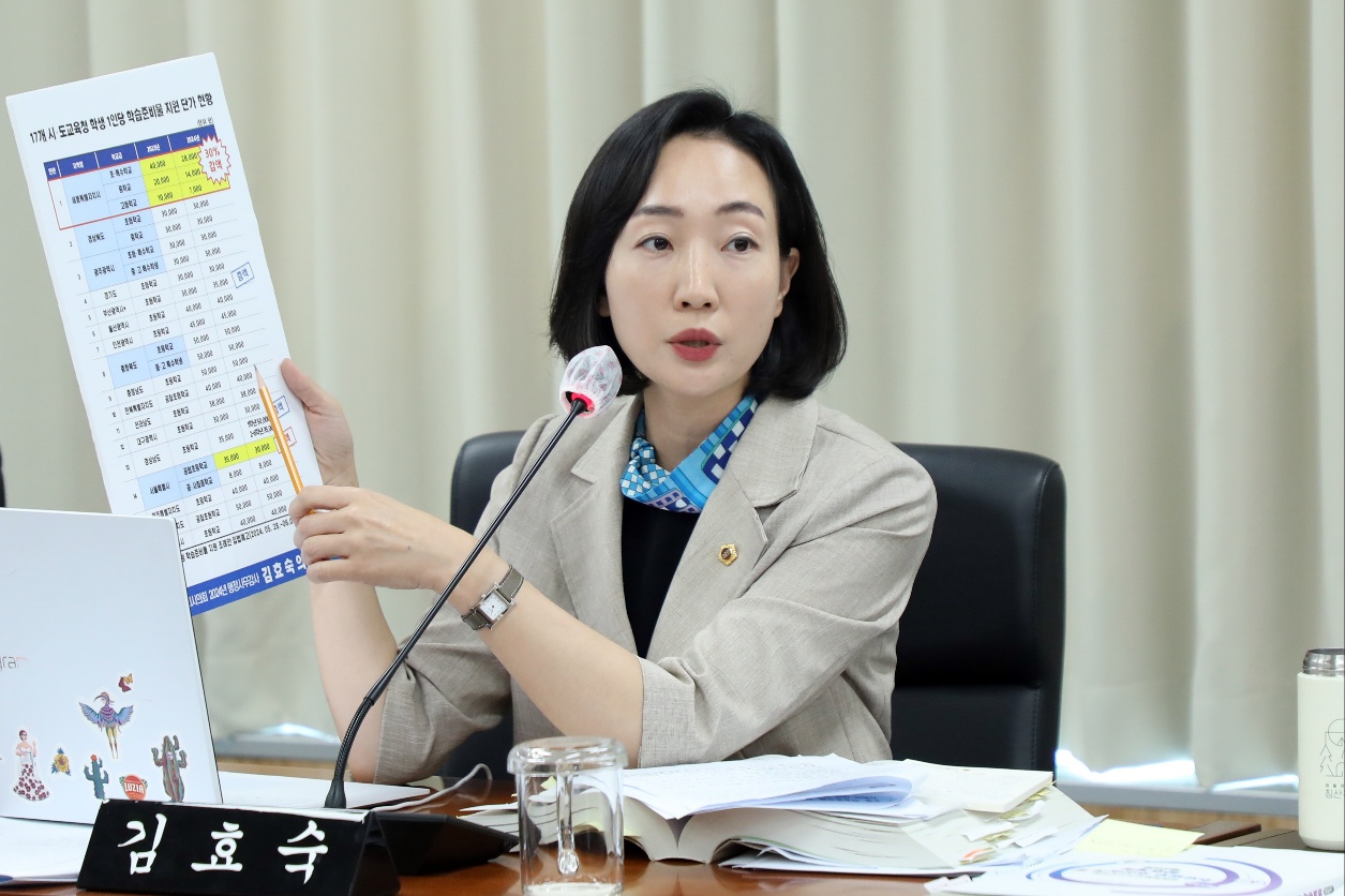 세종시의 교육안전위원회 소속 김효숙 의원(나성동, 더불어민주당)은 4일 열린 2024년도 세종시교육청 정책국 행정사무감사에서 “학습준비물 지원비가 지난해에 비해 대폭 감소했다. 이에 학교 현장에서 학생・학부모・교사 모두 경제・심리적 부담이 가중되고 있으며, 질 높은 수업 운영에도 지장을 초래하고 있다”고 지적했다. 김효숙 의원은 “올해 학습준비물 지원비가 초등・특수학생 28,000원, 중학생 18,000원, 고등학생 7,000원으로 전년 대비 30%~10% 감소하면서 전국 17개 시도교육청 중 초등학생 학습준비물 1인당 지원 단가 최하위를 기록하게 됐다”고 말했다. 행정사무감사 자료에 따르면 세종시교육청은 학습준비물 지원을 지난 2014년 초등학생을 대상으로 개시한 이후, 2015년 초 ・중학생으로까지 확대했으며, 2016년에는 고등학생 및 특수학교 학생까지 범위를 확대했다. 또한 지난해까지 초등학생 4만 원, 중학생 2만 원, 고등학생 1만 원, 특수학교 학생 4만 원을 각각 지원했다. 김 의원은 “학습준비물 지원제도는 보편적 복지의 차원에서 학부모의 경제적 부담을 감소시키고, 학생들에게 학습준비물의 가격과 품질의 차이에서 오는 학습 격차와 위화감도 완화한다. 이는 소외감 없이 공평하게 수업을 들을 수 있는 학습 분위기를 조성해 보다 질 높은 수업이 운영될 수 있도록 지원하는 긍정적 정책”이라고 설명했다. 이어서 “학습준비물 지원비를 전국 17개 시・도 교육청에 문의해 조사한 결과 평균 단가는 36,500원으로, 작년에 비해 감액한 곳은 세종과 서울 두 곳뿐이다. 더군다나 서울은 그 비율이 우리의 절반 수준에 그쳤으며 대부분 그대로 유지하거나 오히려 증액한 곳도 있다”고 밝혔다. 또한 김 의원은 학습준비물 구입에 있어 지역 문구점과의 협력과 상생을 위한 노력을 강조하며 “운영 지침과 계획만 세울 것이 아니라 학교 현장에서 실제 운영되고 있는지 교육청 차원에서 점검하고 평가해 환류 체계를 만들어야 한다”고 당부했다.