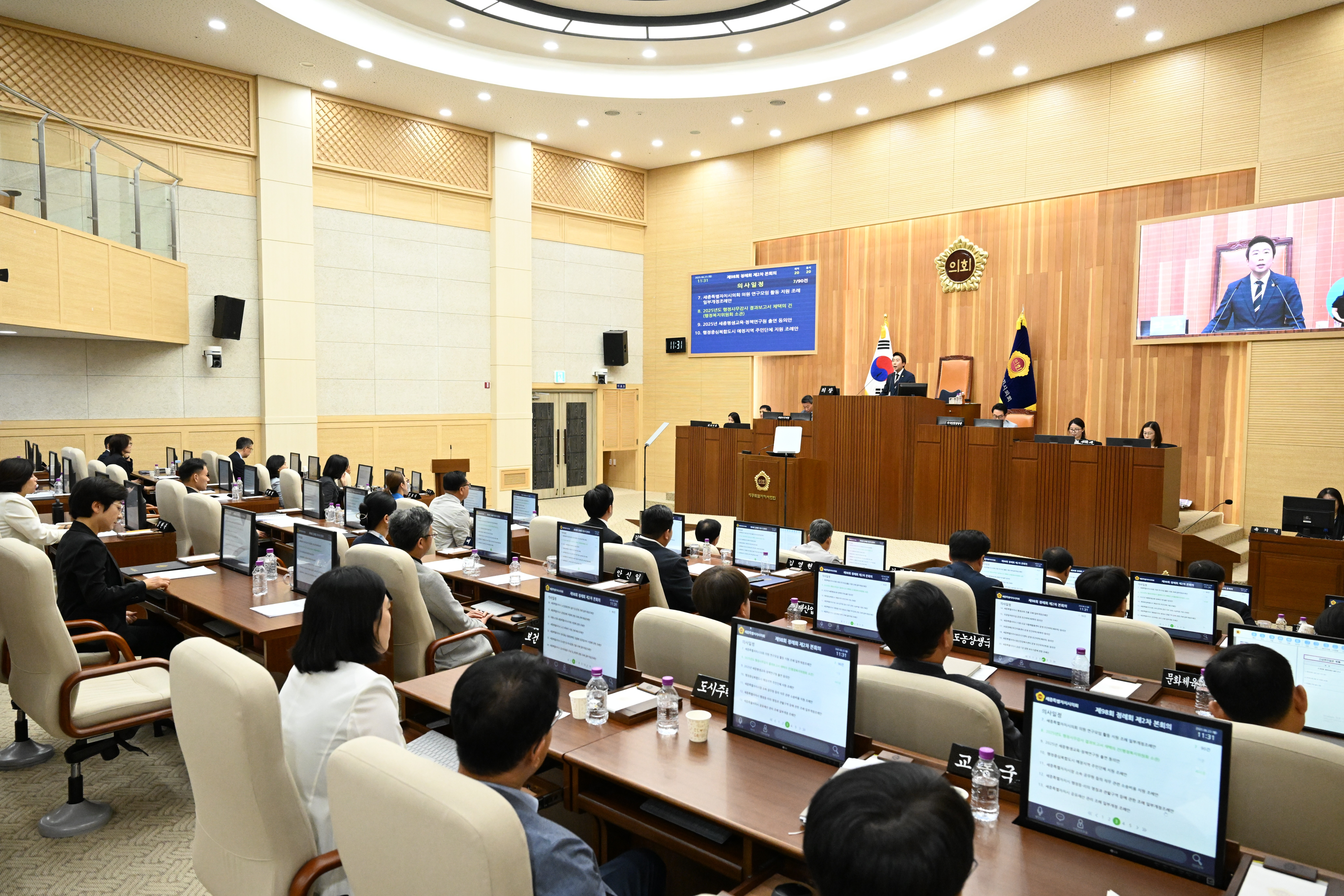 세종특별자치시의회(의장 임채성)는 23일 제98회 정례회 제2차 본회의를 열어 2025년도 제1회 추가경정예산안 등 총 90개 안건을 처리하고 회기를 종료했다. 이날 열린 제2차 본회의에서는 최원석·김현옥·안신일·홍나영·유인호·윤지성 의원 등 총 6명의 의원이 5분 자유발언을 통해 정책 방향을 제시했다. 아울러 이순열 의원이 긴급현안질문을 통해 어진동 데이터센터 설치 승인 추진 절차에 대해 질의한 후 주민 우려 불식을 위한 대책 마련을 촉구했다. 제2차 본회의에서 최종 가결된 안건을 살펴보면, 의회운영위원회 소관 ‘세종특별자치시의회 의원 공무국외출장에 관한 조례 전부개정조례안’ 등 6건, 행정복지위원회 소관 ‘2025년 세종평생교육·정책연구원 출연 동의안’ 등 28건, 산업건설위원회 소관 ‘세종 스마트 국가산업단지 공동사업시행 실시협약 체결 동의안’ 등 30건, 교육안전위원회 소관 ‘공교육 신뢰 회복을 위한 리박스쿨 출신 강사 퇴출 및 진상규명 촉구 결의안’ 등 11건이다. 또한 시청과 교육청의 ‘2024회계연도 세입·세출 결산 승인의 건’, ‘2025년도 제1회 추가경정예산안’ 등 예산결산특별위원회 소관 10건과 행정수도 완성을 위한 특별위원회가 제안한 ‘국토 균형발전과 행정수도 완성을 위한 실행계획 발표 촉구 결의안’도 의결됐다. 더불어 예산결산특별위원회 및 윤리특별위원회 위원을 선임하고 의회운영위원회 위원을 사·보임하는 등 총 90건의 안건을 처리했다.