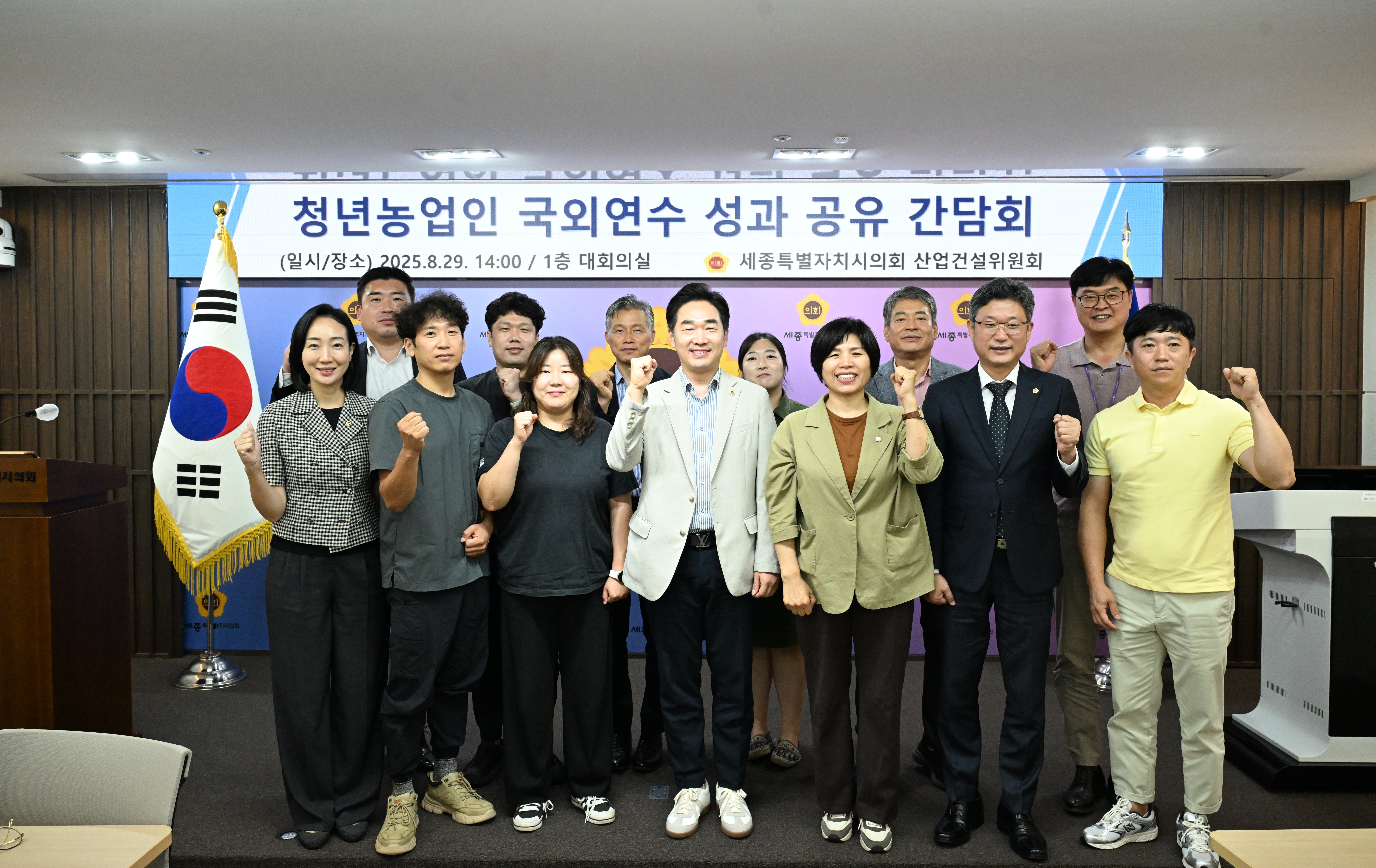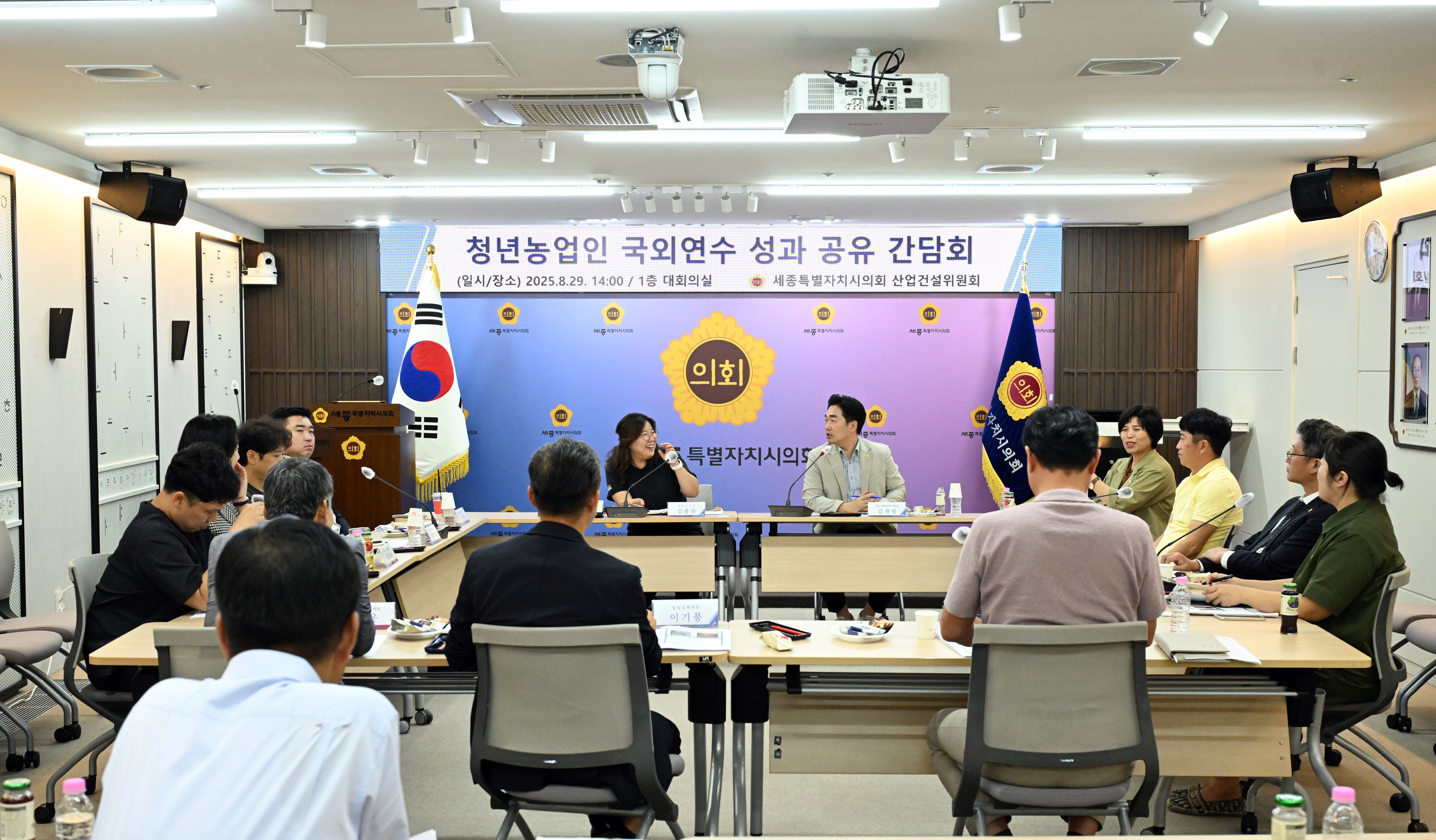 세종특별자치시의회(의장 임채성) 산업건설위원회(위원장 김재형)는 29일 오후 의회 청사 1층 대회의실에서 ‘청년농업인 국외연수 성과 공유 간담회’를 개최했다. 이날 간담회에는 김재형 위원장을 비롯해 최원석 부위원장, 김광운, 김현옥, 김효숙, 안신일 위원과 연수에 참여한 청년농업인, 농업정책과 관계자 등 15명이 참석했다. 이번 간담회는 지난 4월 네덜란드와 독일에서 실시한 청년농업인 국외연수의 성과를 공유하고, 연수 과정에서 얻은 시사점을 지역 농업정책에 반영하기 위해 마련되었다. 간담회에서 청년농업인들은 현지 스마트팜과 시설원예 선진사례에서 보고, 느낀 바를 공유했으며, 이를 세종시 농업 현장에 접목할 방안을 제시하며 의견을 나눴다. 화훼농가 자동화 설비, 친환경 포장재 지원 등 사업에 대한 정책을 제시했다. 또한 위원들은 청년농업인들의 현장 목소리를 청취하고 향후 농업정책 개선 방향에 대해 심도 있는 논의를 이어갔다.