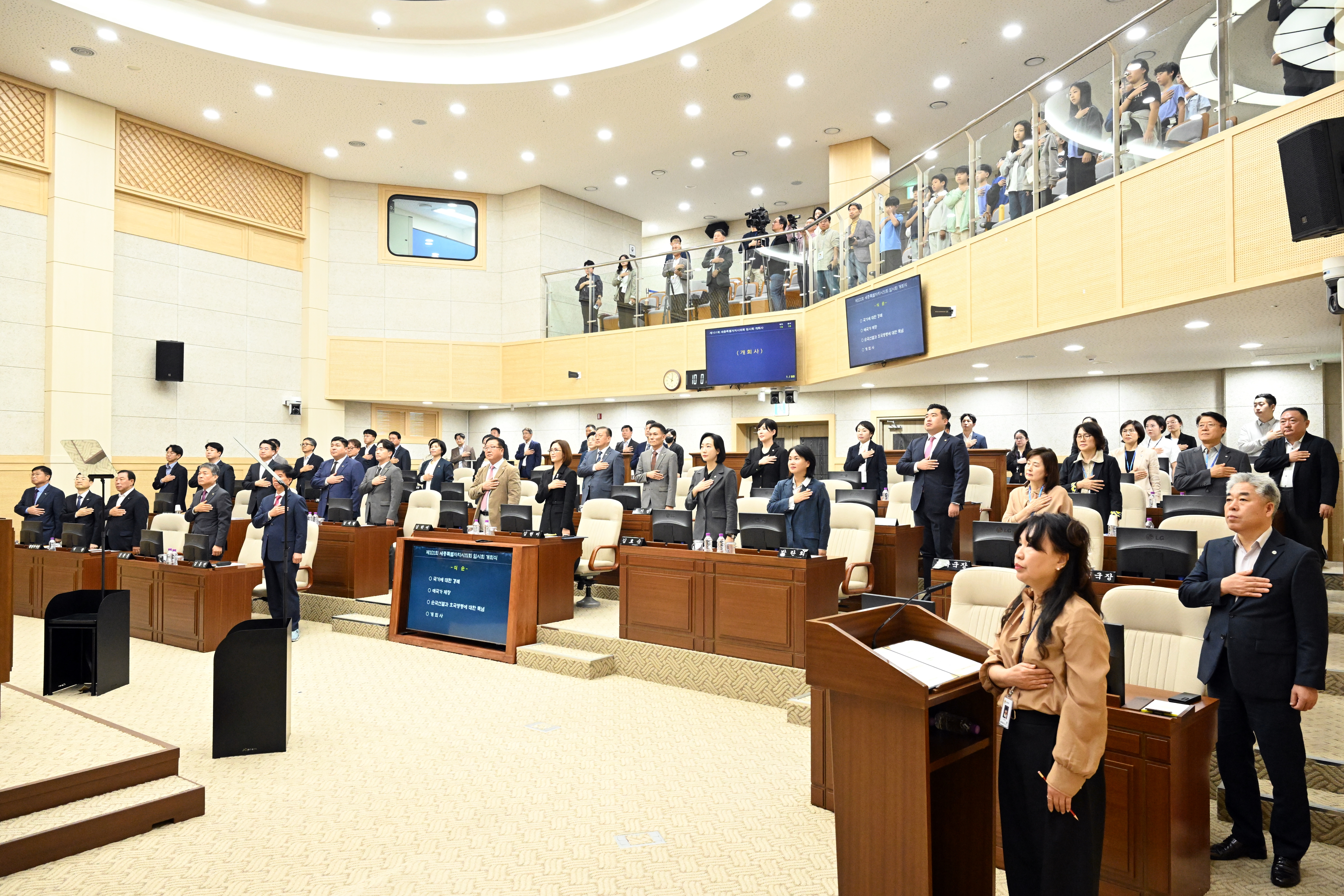 세종특별자치시의회(의장 임채성)는 13일 제101회 임시회를 개회하고 이날 제1차 본회의를 시작으로 24일까지 12일간 회기를 진행한다. 임채성 의장은 이날 개회사를 통해 “지난 9일부터 열린 세종한글축제는 시민 여러분을 비롯한 많은 분들의 참여 속에 한글문화도시로 자리매김한 우리 시의 위상을 잘 보여준 뜻깊은 자리였다”며, “오랜 기간 정성을 다해 꼼꼼히 준비해 주신 모든 관계자에게 깊이 감사드린다”고 말했다. 이어 임 의장은 “국가상징구역 기본계획 공모가 시작되고 5극 3특 국가전략의 설계도가 확정되는 등 균형성장 비전을 구체화할 토대가 마련되었다”며, “행정수도 완성을 위한 계획들이 흔들림 없이 추진되도록 모두가 한마음으로 힘을 모아 주시길 부탁드린다”고 말했다. 이날 열린 제1차 본회의에서는 최원석·김효숙·안신일·김영현·이현정·홍나영 의원 등 총 6명의 의원이 5분 자유발언을 통해 정책 방향을 제시했다. 아울러 김충식 의원이 긴급현안질문을 통해 단층제 구조의 특수성을 반영하지 않고 있는 현행 세종시 보통교부세 산정 체계에 대한 문제점을 제기하고 향후 세종시법 개정을 통한 재정 특례 명문화 추진 방안에 대해 집중 질의했다. 또한 ‘제101회 임시회 회기 결정의 건’, ‘담배 제조물 결함 인정 및 사회적 책임 촉구 결의안’ 등 총 5개의 안건을 처리했다.