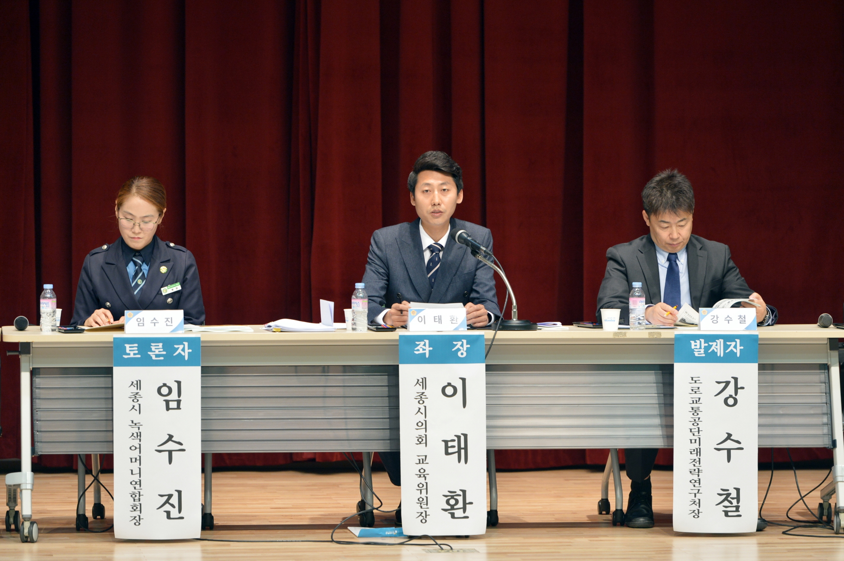 지정토론에서는 이태환 교육위원장이 좌장을 맡아 임수진 세종시 녹색어머니연합회장, 장민주 세종시청 교통과장, 유득근 세종시교육청 학생생활안전과장, 안교필 행복청 사무관, 송글 세종경찰서 교통관리계장 등이 토론자로 나섰다. 장민주 과장은 유관기관과 협조를 통한 시설물 보강 등 시차원의 역할 및 대책 마련에 대하여 설명하면서, 덧붙여 어린이 교통안전을 위해서는 우선적으로 시민의식 향상이 선행되어야 한다고 주장했다. 유득근 과장은 세종시 관내 통학로 현황과 문제점에 대해 설명하며, 신설학교 배치시 통학로 안전을 고려하여 큰 도로를 횡단하지 않도록 하는 방안에 대해 적극 검토하겠다고 밝혔다. 안교필 사무관은 지난 2011년 행복도시 공공디자인 설계용역을 통해 어린이 보호구역 조성기준을 마련하고 현재 지구단위계획에 반영하고 있으며, ‘18년 개교 예정인 13개 학교 개교시기에 맞춰 안전한 통학로 확보에 노력하겠다고 의지를 피력했다. 송글 계장은 관내 어린이 교통사고 현황을 설명하고, 어린이 교통안전활동 강화로 체감안전도를 높이겠다고 말했다.