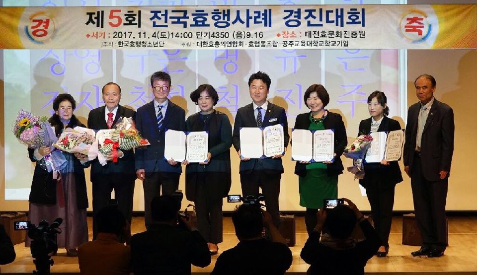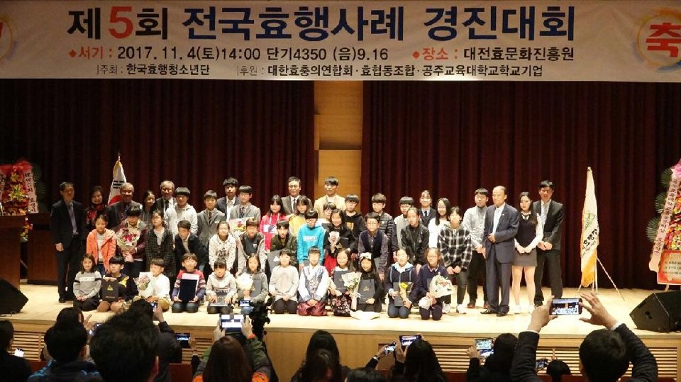 올해로 다섯 번째를 맞는 효행사례 경진대회는 청소년들의 효심을 계발하여 미래의 훌륭한 인재를 육성하는 매우 뜻깊은 행사로, 100여명의 내빈이 참석한 가운데 11월 4일(토) 14시 대전효문화진흥원 대강당에서 열렸다.