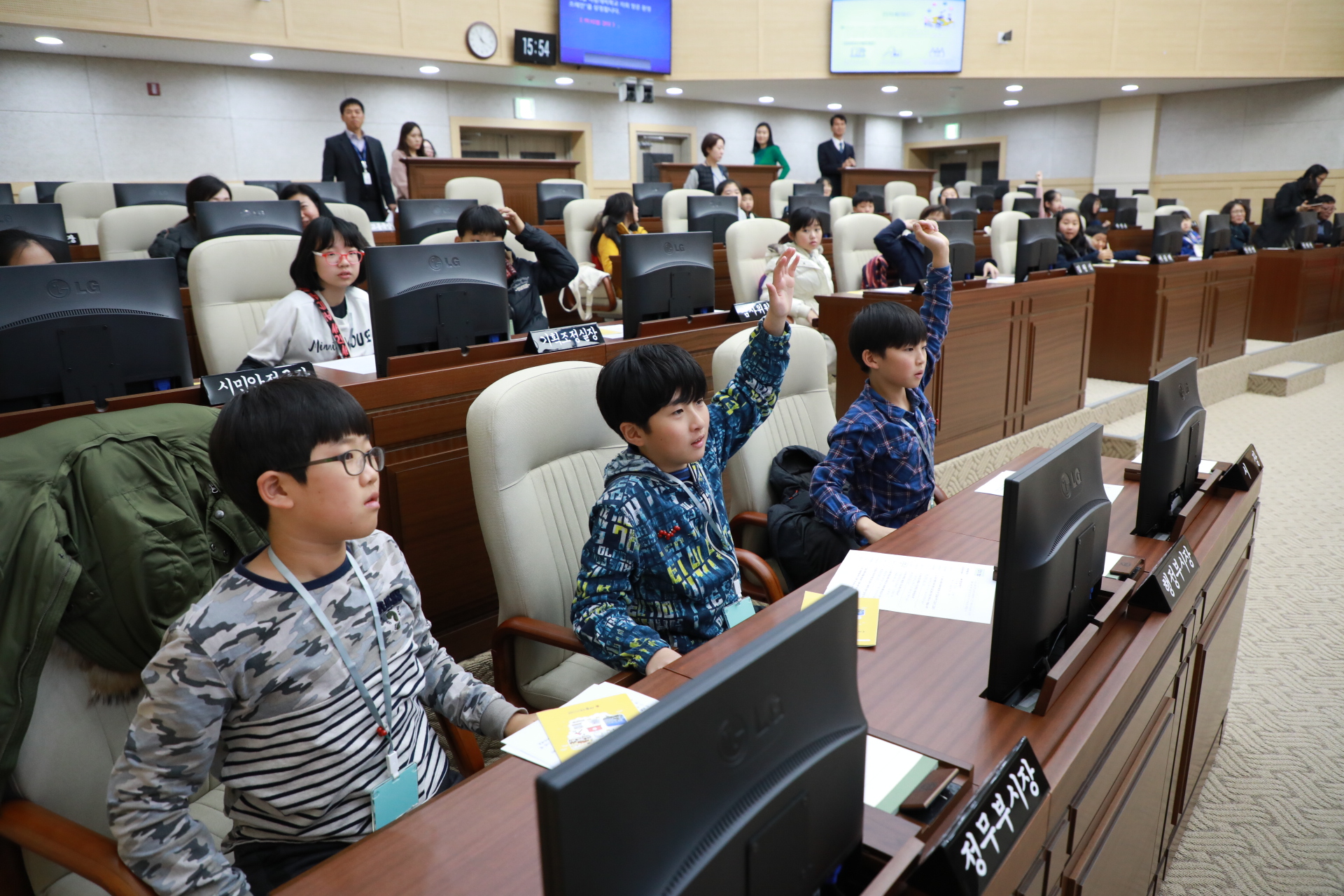 첫마을 바람개비학교 학생 및 학부모 26명이 11월 20일 세종특별자치시의회(의장 고준일)를 방문하여 시설 견학 및 체험 행사를 가졌다. |