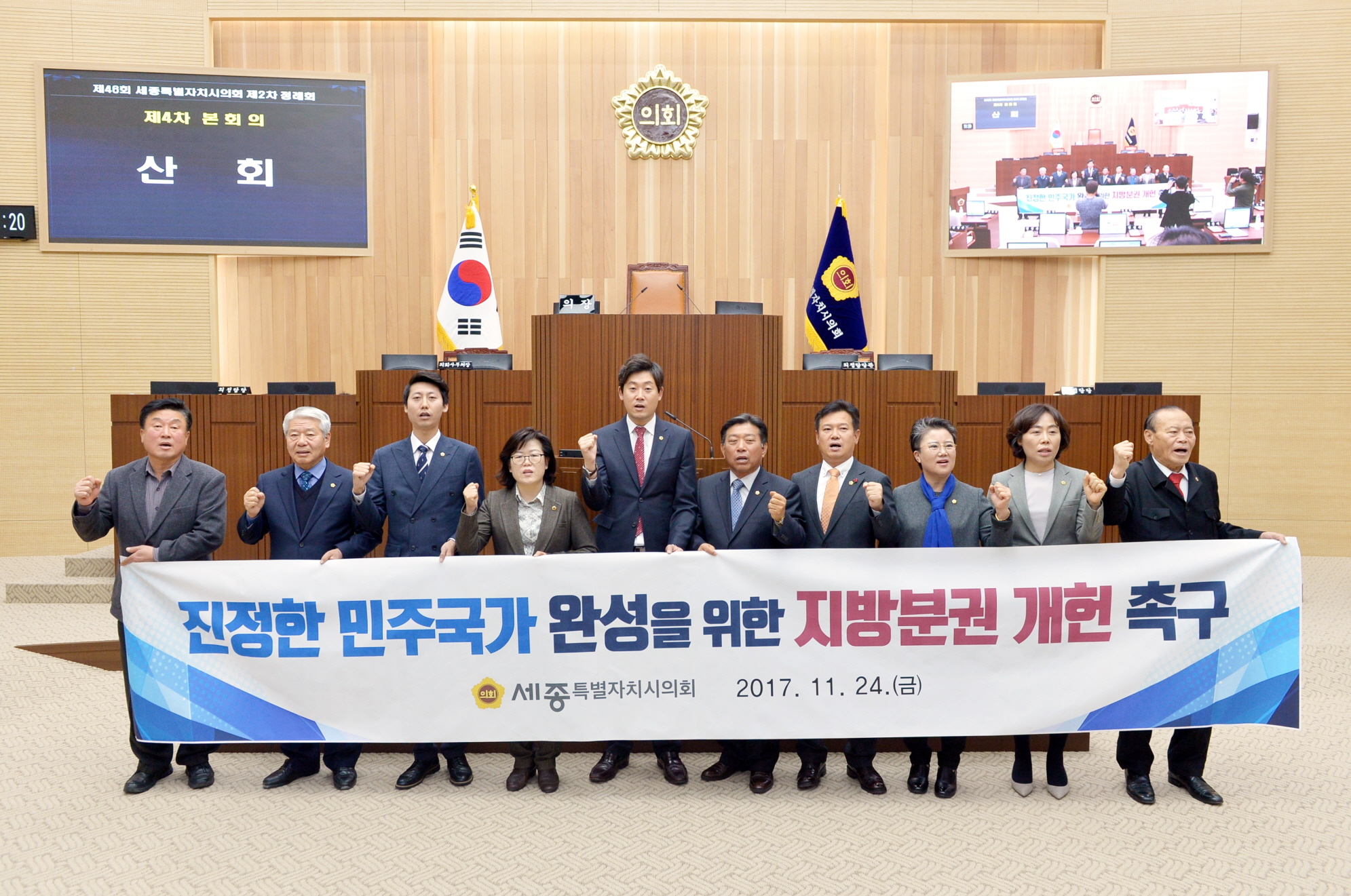 세종특별자치시의회(의장 고준일)는 24일 제46회 제2차 정례회 제4차 본회의에서 박영송 의원이 대표 발의한 ‘진정한 민주국가 완성을 위한 지방분권 개헌 촉구 결의안’을 채택했다. |