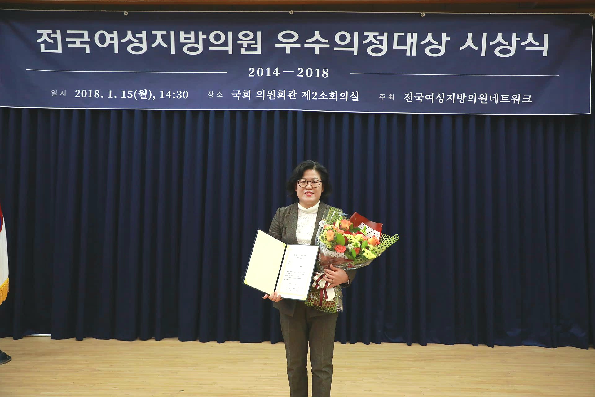 세종특별자치시의회(의장 고준일) 박영송 의원(더불어민주당)이 15일(월) 국회의원회관에서 열린 ‘전국여성지방의원네트워크 우수의정대상’ 생활정치분야에서 최우수상을 수상했다. ‘전국여성지방의원네트워크 우수의정대상’은 각 분야에서 우수한 의정활동을 펼친 전국 여성지방의원들에게 수여하는 것으로, 모범적인 의정활동 사례를 공유하고 널리 확산하여 여성의 정치참여 확대에 기여하기 위해 ‘전국여성지방의원네트워크’가 2010년부터 4년마다 한 번씩 주최하여 시상해오고 있다. 박영송 의원은 지난 4년 동안 세종시민의 삶의 질 향상과 시정 발전을 위해 활발한 의정활동을 펼쳐 왔으며, 특히 2017년 대표를 맡은 ‘아동‧청소년 친화도시 조성을 위한 연구모임’ 활동 등을 통해 ▲세종시의 아동친화도시 인증을 지원 ▲아동‧청소년의 돌봄, 먹거리 안전, 놀이 활동 연구 ▲관련 조례 제‧개정 등 아동‧청소년 친화도시 조성을 위해 다각적인 노력을 펼친 것이 높게 평가되었다.