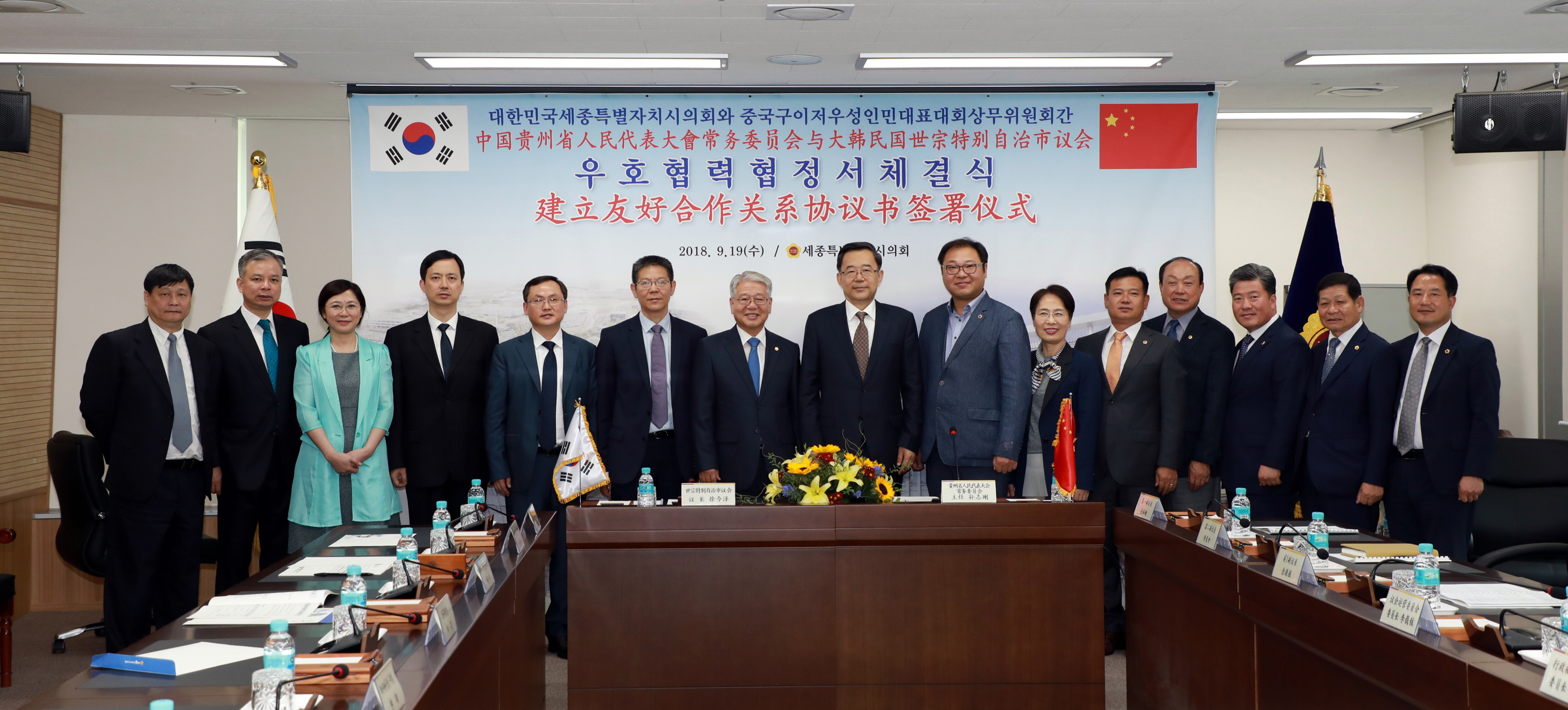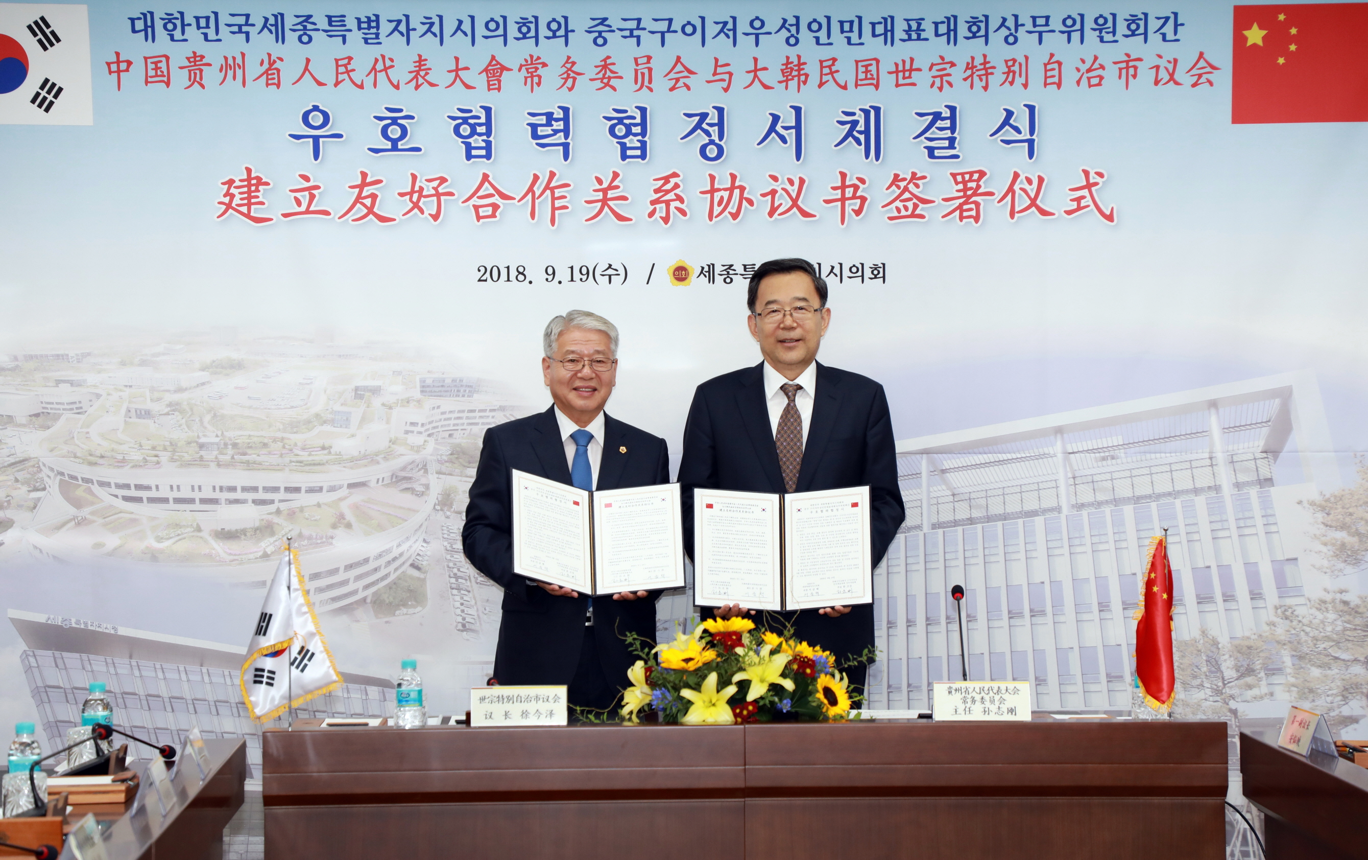 세종시의회(의장 서금택)는 9월 19일 중국 구이저우성 인민대표대회 상무위원회의 예방을 받고 의정실에서 상호 우호협력협정서를 체결했다.