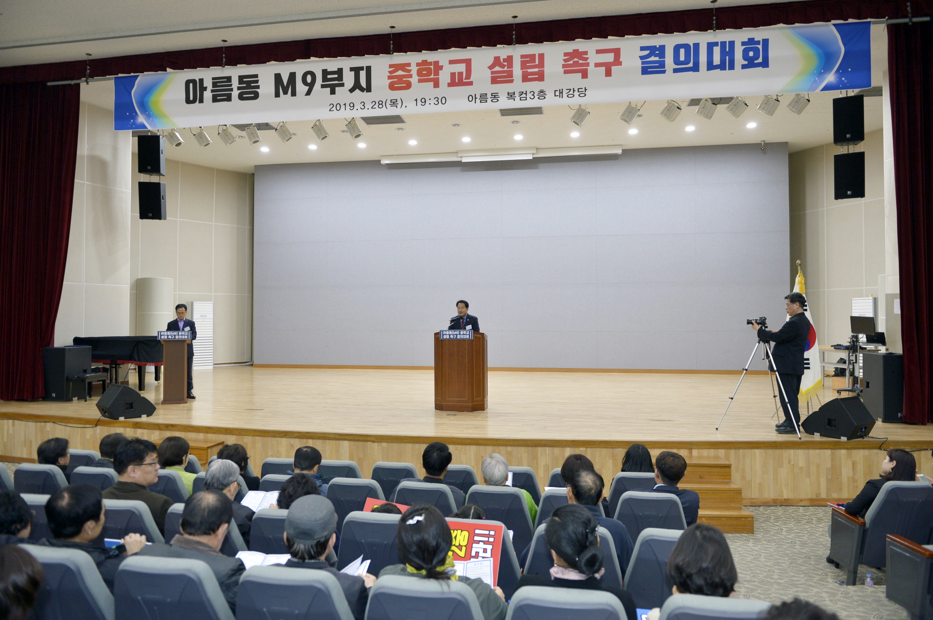 아름동 주민 등이 참석한 가운데 28일 아름동 복컴에서 ‘아름동 내 중학교 설립촉구 결의대회’가 열렸다.
